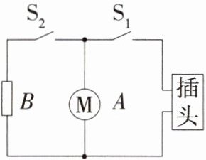 8.「2025湖北应城期中,☆☆」如图为一个电吹风的简易电路,它有吹凉风和热风两个挡位,$A$为带动风扇转动的电动机,$B$为发热用的电阻丝。关于该电吹风的工作情形,下列说法正确的是( )