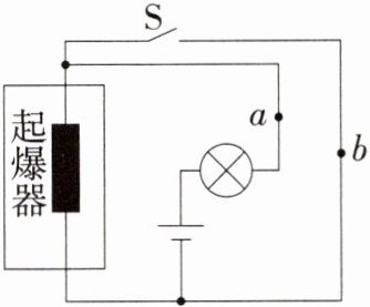 10.跨学科工程实践「2025贵州贵阳十七中期中,☆☆」某定时爆破装置,其引爆电路如图所示,当设定起爆时间一到,$S$会自动断开,电流通过起爆器引爆炸弹。为使引爆装置停止工作,拆弹专家应剪断____(选填“$a$”或“$b$”)处导线。