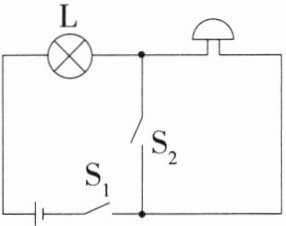 解析 只闭合S₁时,电流从电源正极出发经过灯泡、电铃后回到电源负极,此时灯亮、铃响;只闭合S₂时,电路处于断路状态;同时闭合S₁、S₂时,电铃被短路,灯亮、铃不响。