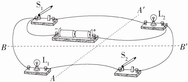 B 由图可知,S₁、灯泡L₂与电源可组成串联电路,S₂、灯泡L₁与电源可组成串联电路,若挡板沿AA'固定,则可通过开关控制另一侧的灯泡,达到发送信息的目的;若挡板沿BB'固定,开关S₁和开关S₂只能控制同一侧的灯泡,故无法通过开关控制灯泡,达到发送信息的目的。