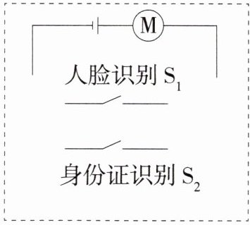 解析 根据题意可知,只有“人脸”和“身份证”一致的情况下,闸门自动打开,说明人脸识别开关和身份证识别开关相互影响,是串联的,然后与电动机串联,如图所示。