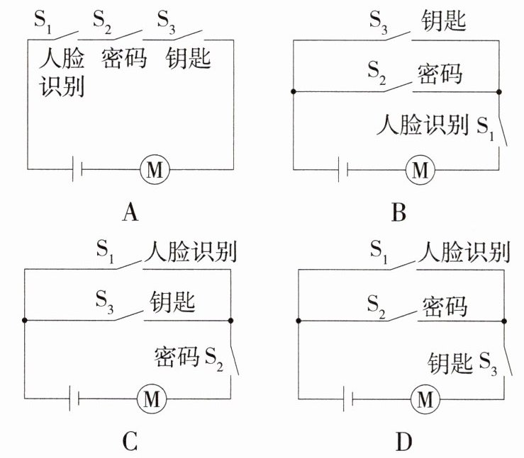 9.跨学科工程实践「2024湖南中考,★☆」科技小组模拟“智能开锁”设计的电路图,有两种开锁方式,即“人脸识别”与输入“密码”匹配成功,或“人脸识别”与使用“钥匙”匹配成功才可开锁。现用$S_1$表示人脸识别$,S_2、$$S_3$表示密码、钥匙。匹配成功后对应开关自动闭合,电动机才工作开锁。满足上述两种方式都能开锁的电路是( )