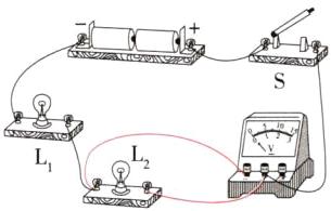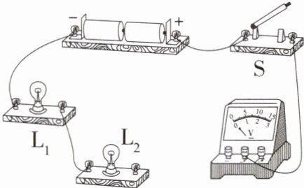 解析 灯泡L₁和L₂串联,则电流从电源正极出发,依次经过开关、两灯泡后回到电源负极;电压表测量灯泡L₂两端的电压,则电压表应并联在灯泡L₂两端,如图所示。