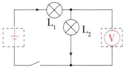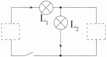 7.「2025湖南郴州期中」如图所示,若开关闭合后,电路中的电流方向为箭头所指方向,请将电池、电压表两个元件符号分别填入虚线框内,使开关闭合后灯泡$L_1$和$L_2$串联且都能够正常发光。