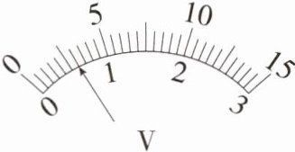 6.「2025广东东莞期中」电压表的表盘及指针如图所示,若接“0~3V”量程,电压表的读数为______V;若接“0~15V”量程,表盘上每一小格代表______V,读数为______V。