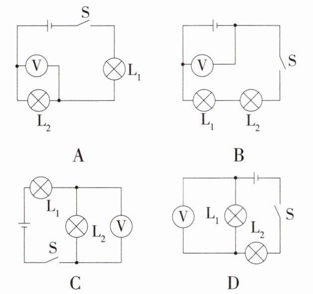 D A选项中电压表与灯泡L₂并联,测量的是灯泡L₂两端的电压,故A错误;B选项中电压表与电源并联,测量的是电源电压,故B错误;C选项中电压表与L₂并联,测量的是灯泡L₂两端的电压,故C错误。D选项中电压表并联在L₁两端,测量的是L₁两端的电压,故D正确。
