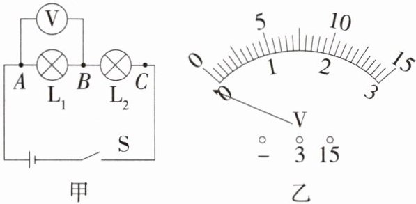 19. 新课标科学思维「2025安徽蚌埠期中」如图甲所示的电路中$,V_1$和$V_2$是两只相同的电压表,闭合开关后,灯泡$L_1、$$L_2$都发光,这时两只电压表的指针偏转角度相同,指针位置如图乙所示。