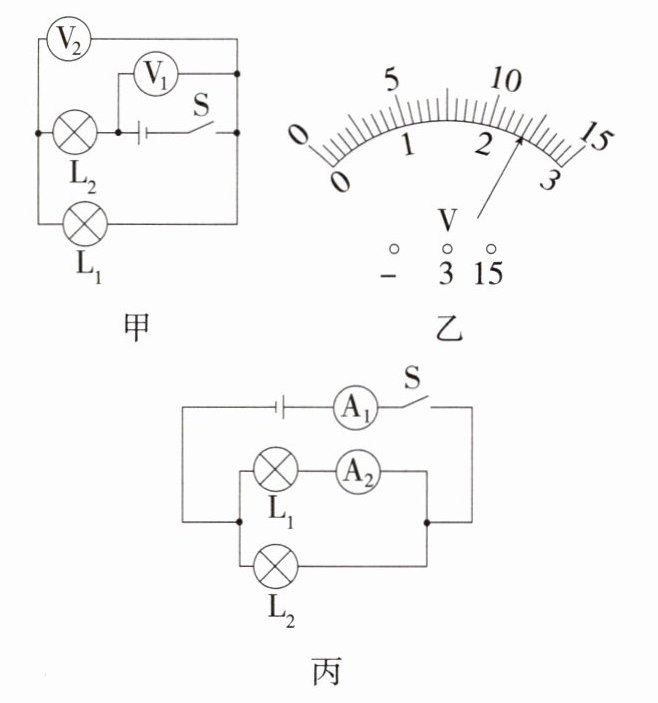 (2) 若将两灯泡改接至如图丙所示的电路中,电源电压与图甲中的相同且保持不变,闭合开关后,灯泡$L_1、$$L_2$都发光。此时电流表$A_1$的示数为2.6A,电流表$A_2$的示数为1.2A,求通过灯泡$L_2$的电流和灯泡$L_2$两端的电压。