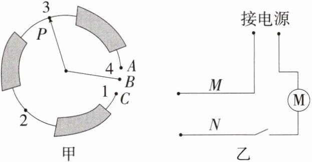 10.「2025山东乳山期中,★☆」如图甲所示为某种电风扇调速器的示意图,P为旋钮的滑片,可转动改变挡位。调速器应与电动机______联接入电路,若要由1挡转至4挡可使电风扇风速增大,应将接线柱______(选填“A和B”“B和C”或“A和C”)接入电路。