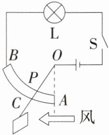 答案 滑动变阻器 亮度 转换 小 解析 无风时OC是竖直的,弧形电阻接入电路的是AB段,有风时,OC杆偏转一定的角度,接入电路的是BP段,接入电路的电阻随风的大小而改变,所以金属杆OC与弧形电阻AB组合在一起相当于一个滑动变阻器;风越弱,OC杆偏转的角度越小,弧形电阻接入电路的电阻越大,电源电压不变时,灯泡越暗,通过灯泡的亮度判断风力的大小,这利用了转换法。