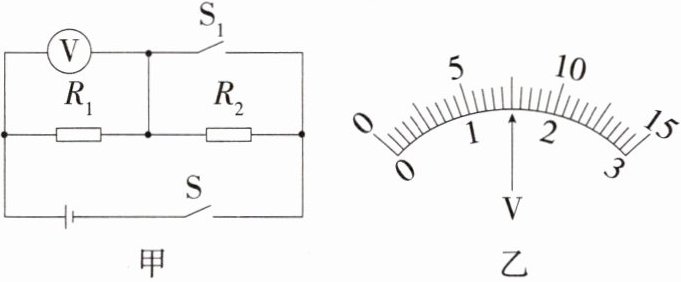 4. 「2024广东龙川期末,★☆」如图甲所示电路,先闭合开关S,断开$S_{1}$,电压表的示数是4.5V,再闭合$S_{1}$,电压表示数如图乙所示,则$R_{1}$、$R_{2}$的阻值之比是( )
