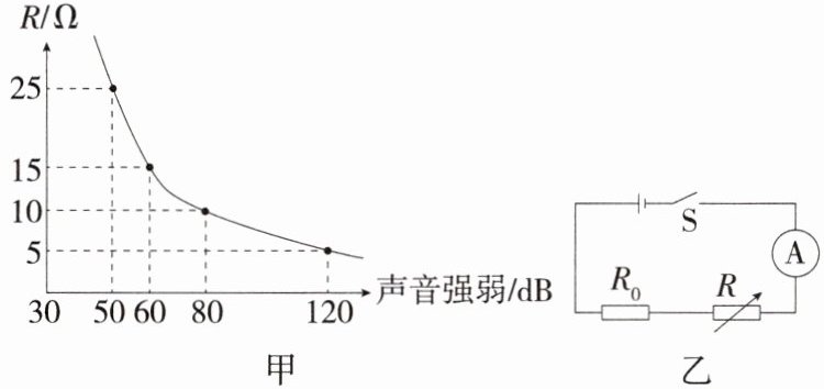 2. 新环境保护「2024四川遂宁中考」噪声污染是当代社会四大污染之一,若青少年长期处于噪声环境中会影响身心健康。为了监测噪声的强弱,同学们找来定值电阻$R_{0}$、声敏电阻$R$(阻值会随声音强弱发生变化)、电流表、学生电源等器材,设计了可用电流表的示数来反映噪声强弱的装置,其中$R$的阻值随声音强弱变化的关系如甲图所示,该装置电路如乙图所示。在某次测试中,当噪声80dB时,电流表示数为0.4A;当噪声50dB时,电流表示数为0.2A。下列选项正确的是( )