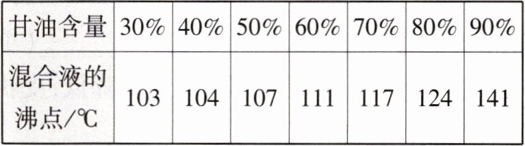 12.「2025河南新乡一中月考」小华在课外书上了解到在水中加入不易挥发的甘油(原液)后沸点会升高。如表所示,为甘油与水按不同的比例混合后,混合液的沸点(表中甘油含量是指甘油在混合液中所占体积的百分比)。小华在水中加入一些甘油后,随着加热时间的增加,烧杯中混合液会减少,与原来相比,混合液的沸点______(选填“升高”“降低”或“不变”),其原因是______(选填“甘油”或“水”)变______(选填“多”或“少”)了。