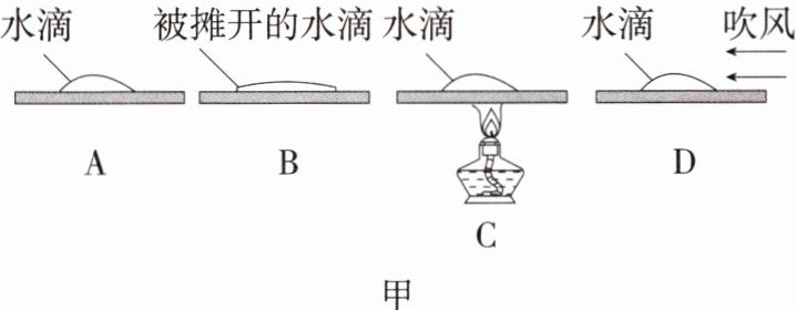 11.新科学探究「★☆」小明同学在4块相同的玻璃板上各滴一滴质量相同的水,进行如图甲所示的实验探究,得出水蒸发快慢与水的温度、水的表面积和水面上方空气流速有关。
