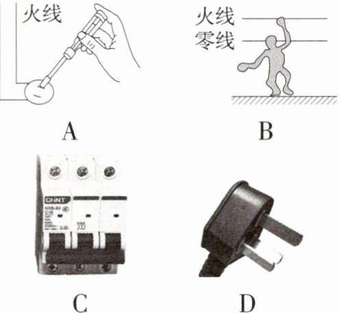 AD 使用测电笔时,手指不能与测电笔笔尖金属体接触,但必须接触笔尾金属体,故A正确。人站在大地上,一只手触摸到了火线,也会触电;当有人触电时应先切断电源,不能用手直接拉拽触电者,这样施救的人也会触电,故B错误。空气开关"跳闸"后,要排除故障后才能重新合上,故C错误。三脚插头接地线的脚比其他两个脚要长一些,其目的是插插头时使家用电器的金属外壳先接地线,拔插头时能使金属外壳后离开地线,避免发生触电事故,确保用电安全,故D正确。