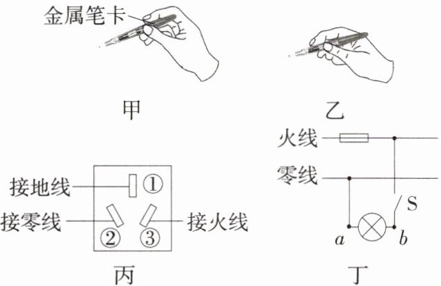 D.图丁,闭合开关,灯正常发光时,用测电笔测 a 点裸露的导线,氖管会发光