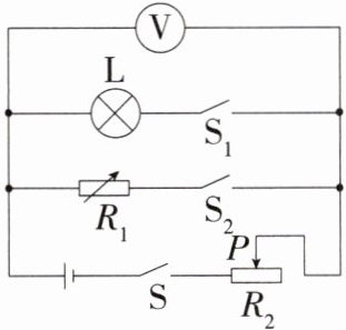 6. 新中考 实验新考法 [2025 陕西西安八十五中月考」小明想测一个额定电压为$U_{0}$的小灯泡的额定功率。他利用学生电源(电压未知)、电阻箱$R_{1}$、滑动变阻器$R_{2}$(电阻足够大)和电压表设计了如图所示的电路。为了精确地测量这个小灯泡的额定功率,请完成相关实验步骤。