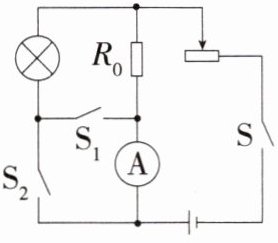 ①只闭合开关 S 和____(选填“$S_{1}$”或“$S_{2}$”),移动滑动变阻器的滑片,使电流表的示数为____,此时小灯泡正常发光;