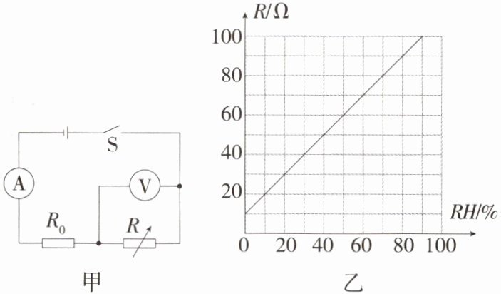 串联电路中各处的电流相等,所以通过R的电流Iᵣ=I₀=0.1 A。此时R的阻值R=Uᵣ/Iᵣ=9 V/0.1 A=90 Ω。由图乙可知,此时的空气湿度为80%。