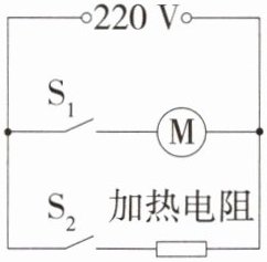 10. 「2025 福建泉州五中期未,★☆」如图所示为某款足浴盆的工作电路示意图,该足浴盆有加热和按摩两种功能。已知电动机 M 的额定功率为 22 W,线圈电阻为 $ 2 \Omega $,加热电阻正常工作时的电功率为 800 W,电压保持 220 V 不变。只闭合开关 $ S_2 $ 启动加热功能,加热电阻正常工作 10 min 消耗电能______J;只闭合开关 $ S_1 $ 启动按摩功能时,按摩 10 min 电动机线圈产生的热量为______J。