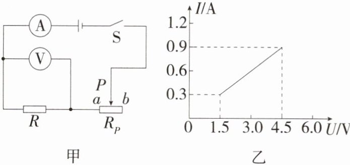 C 由图甲可知,定值电阻R与滑动变阻器Rₚ串联,电流表测电路中的电流,电压测定值电阻R两端的电压。当滑片P在a端时,Rₚ接入电路的电阻为0,电路中只有R工作,则电压表示数最大且等于电源电压,由图乙可知,电源电压U=Uₐ=4.5 V,此时电路中的电流Iₐ=0.9 A,根据欧姆定律可得,定值电阻R=Uₐ/Iₐ=4.5 V/0.9 A=5 Ω,故①错误,②正确。当滑片P在b端时,由图乙可知,R两端的电压Uᵦ=1.5 V,此时电路中的电流Iᵦ=0.3 A,根据串联电路的电压规律,Rₚ两端电压Uₚ=U-Uᵦ=4.5 V-1.5 V=3 V,根据欧姆定律可得,滑动变阻器的最大阻值Rₚ=Uₚ/Iᵦ=3 V/0.3 A=10 Ω,通电1 min,电阻R产生的热量Q=Iᵦ²Rt=(0.3 A)²×5 Ω×60 s=27 J,故③④正确。故选C。