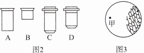 (3)小明在视野中观察到图3污点“甲”,她尝试判断该污点的位置:先移动装片,若发现污点与装片的移动方向____(填“相同”或“相反”),则说明污点在装片上;若污点不动,再转动图1中的③,发现污点随之转动,说明污点在____(填“物镜”成“目镜”)上。