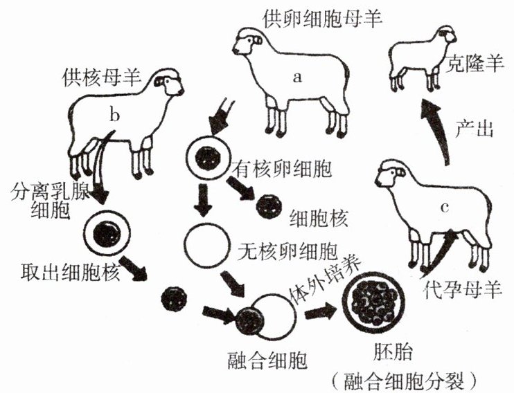 7. 克隆羊多莉有a、b、c三位“母亲”,它们分别给多莉的出生提供了一定的条件。