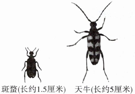 上图为斑蝥和我国常见的农业害虫天牛的图片,请仔细观察、比较,找出这两种昆虫的部分相同之处和不同之处: