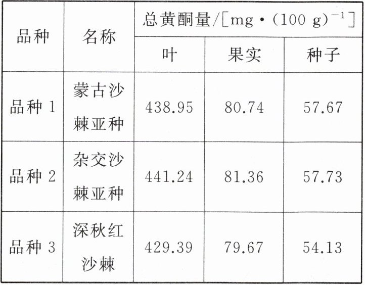 (3)为了探究沙棘不同部位含的总黄酮量,科研人员测得了沙棘叶、果实和种子中的总黄酮量(见下表)。结果表明不同种沙棘不同部位中黄酮类成分存在明显差异,其中______(填器官)中的总黄酮量最高;比较不同品种沙棘含的总黄酮量可知,品种______最适合用于药品的开发。