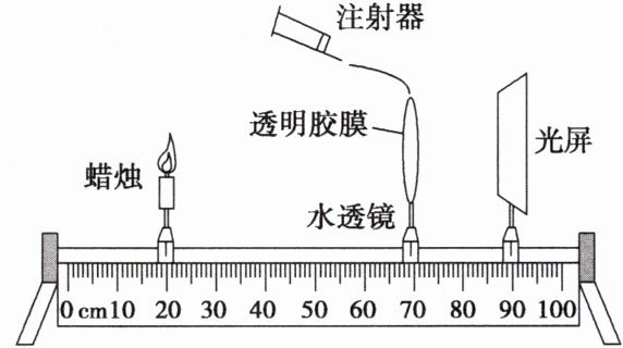 (选填"放大""等大"或"缩小")的实像。若将点燃的蜡烛向左移动一小段距离,要使光屏上重新得到清晰的像,应对水透镜抽水