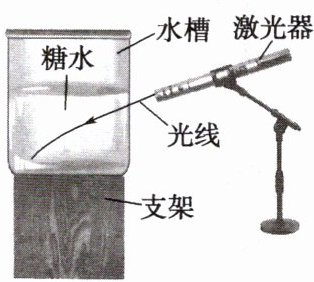 【进行实验】如图所示,在支架上固定一个薄水槽,其中放置一个白屏来显示光的路径。事先配有四杯浓度不同的糖水,将它们按浓度从高到低依次倒入水槽(四种糖水的量按一定的比例配制),由于各层糖水间相互混合,所以水槽内形成了从上到下浓度逐渐变高的不均匀糖水。将一束激光从透明水槽侧面沿白屏表面以75°左右的入射角,由最上层糖水斜向下射入非均匀糖水中,观察到激光路径在非均匀糖水中向下弯曲。同时做一个对照实验,将激光光束射入同种均匀的蔗糖溶液中,观察到光的路径是直线。