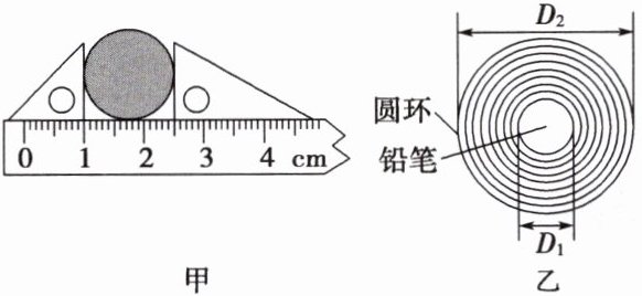 (2) 一条纸带厚薄均匀,他把纸带紧密地环绕在圆柱形铅笔上,直至恰好能套进一个圆环中,如图乙所示。纸带环绕了n圈,则纸带的厚度是