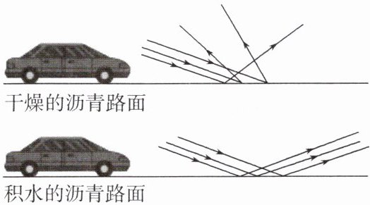 8. (2025·济宁期中)如图所示是晚上汽车在干燥的沥青路面和积水的沥青路面上行驶时,大灯发出的光照射到地面上的光路图,则(