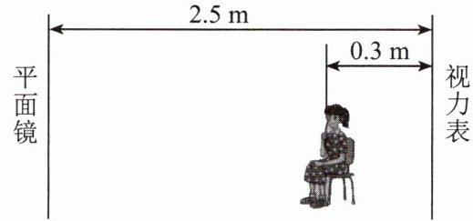 8. 如图所示,检查视力时,将视力表放在被测者头部的后上方,被测者识别对面墙上镜子里的视力表的像。则视力表中开口向下的“$m$”字在镜中的开口方向和距被测者的距离分别为(