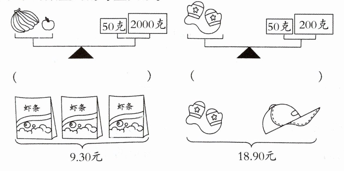【答案】:南瓜质量$ +$苹果质量$ = 50 + 2000$;手套质量$ = 50 + 200$;$3×$每袋虾条价格$ = 9.30$;手套价格$+$帽子价格$ = 18.90$。