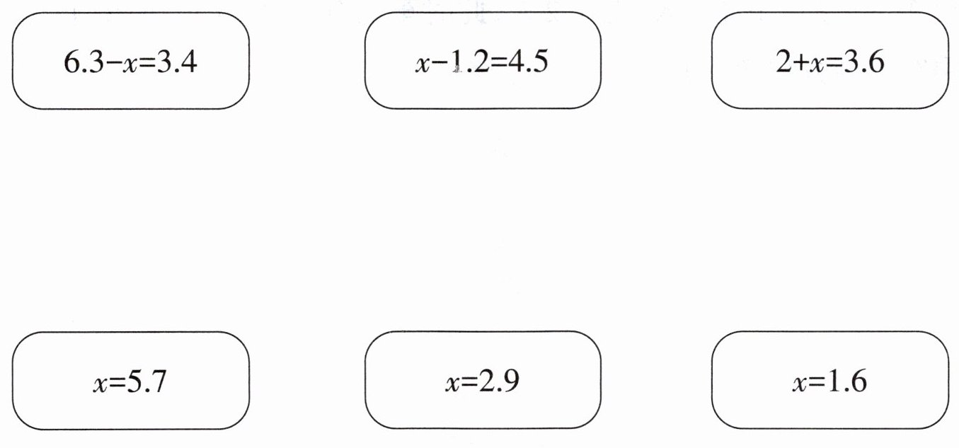 $6.3 - x = 3.4$与$x = 2.9$相连;$x - 1.2 = 4.5$与$x = 5.7$相连;$2 + x = 3.6$与$x = 1.6$相连。