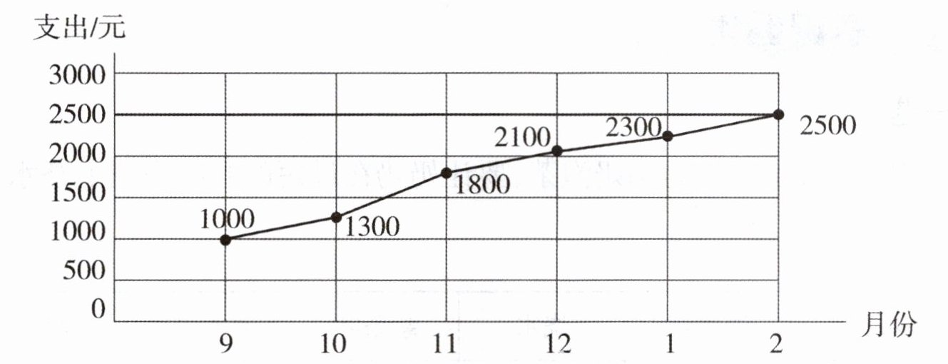 (1)观察统计图,从9月到2月,购物支出的数据依次为$1000$、$1300$、$1800$、$2100$、$2300$、$2500$,数值逐渐增大,所以张明家近6个月的购物支出呈现上升趋势。