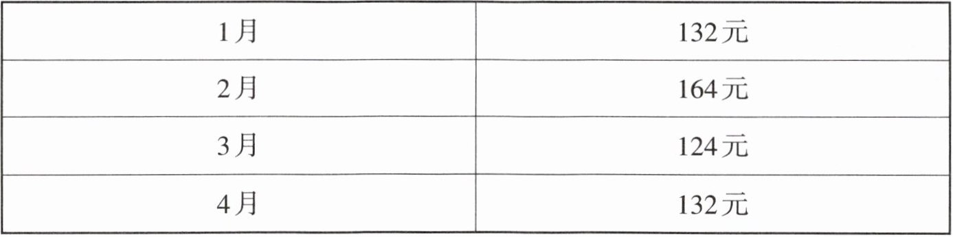 【解析】:首先,计算这$4$个月电费的总和:$132 + 164 + 124 + 132 = (132 + 132)+(164 + 124)=264 + 288 = 552$(元)。