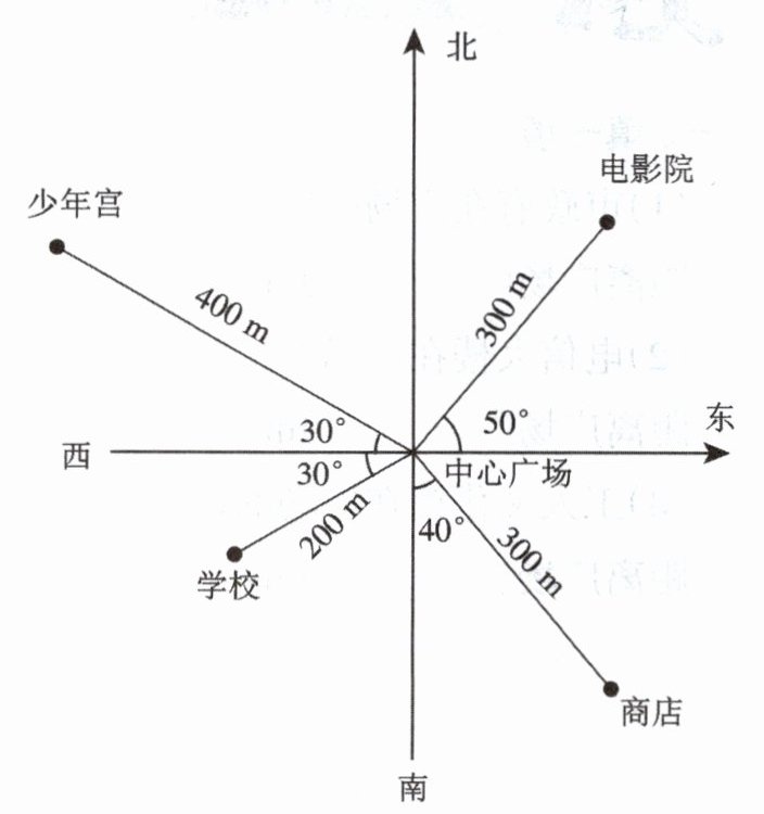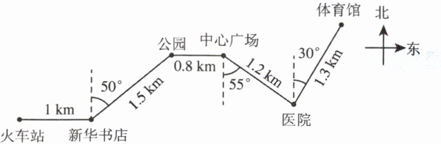 从火车站出发,先向东走$1km$到新华书店,再向北偏东$50^{\circ}$方向走$1.5km$到公园,接着向东走$0.8km$到中心广场,最后向南偏东$55^{\circ}$方向走$1.2km$到医院。