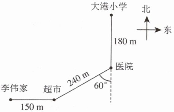 东偏北$60^{\circ}$(或北偏东$30^{\circ}$)、$240$、医院、正北、$180$