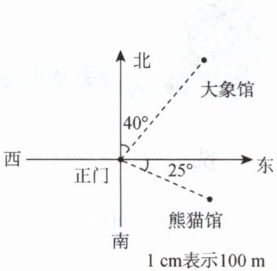 【答案】:大象馆在正门北偏东$40^{\circ}$方向$200m$处,熊猫馆在正门东偏南$25^{\circ}$方向$150m$处。
