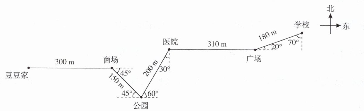 豆豆从家出发,先向东走$300m$到商场,再向东偏南$45^{\circ}$方向走$150m$到公园,接着向北偏东$60^{\circ}$方向走$200m$到医院,然后向东走$310m$到广场,最后向东偏北$20^{\circ}$方向走$180m$到学校。