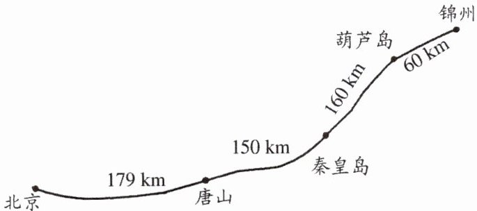 【解析】:将锦州到葫芦岛的$60$千米、葫芦岛到秦皇岛的$160$千米、秦皇岛到唐山的$150$千米、唐山到北京的$179$千米相加,即$60 + 160 + 150 + 179 = 549$(千米)。