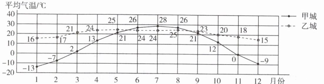 (4)春节一般在1月或2月,甲城气温低(1月$-13^{\circ}C$,2月$-7^{\circ}C$),乙城气温高(1月$16^{\circ}C$,2月$17^{\circ}C$)。