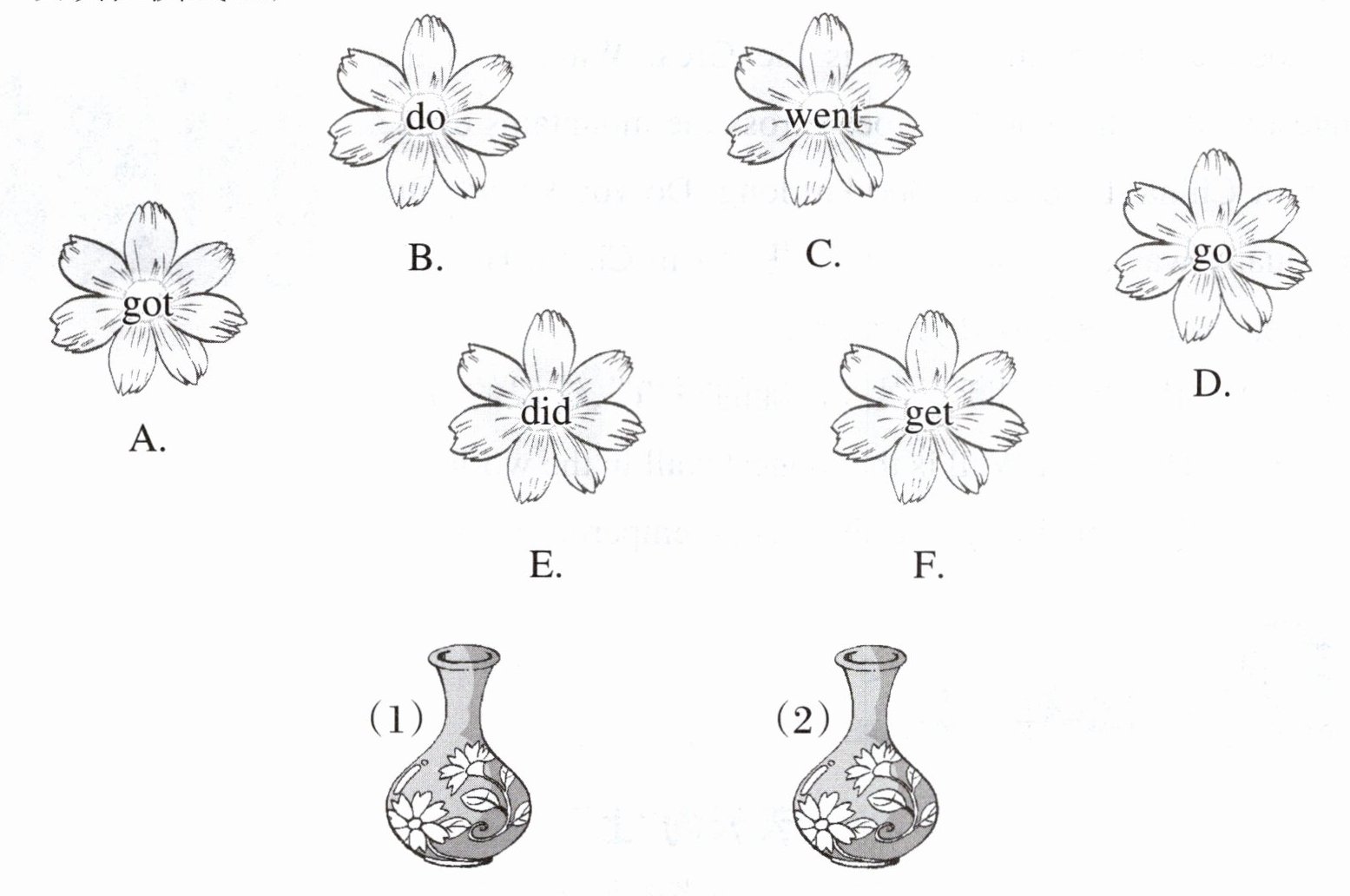 1. 让我们帮助小朋友把不同的花插到它们对应的花瓶里去吧!(把单词对应的选项填在横线上)