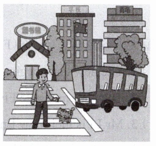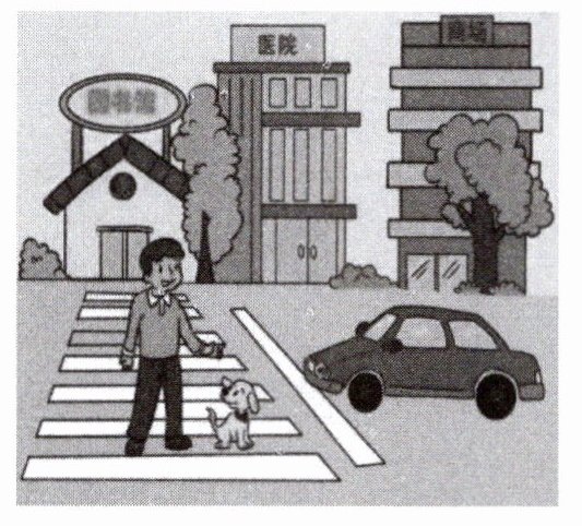 Look at the picture. Mingming is walking on the street with his dog. There is a tree in front of the mall. There is a hospital near the mall. There is also a library. Mingming often reads books in it. There is a car in the picture. It's red.