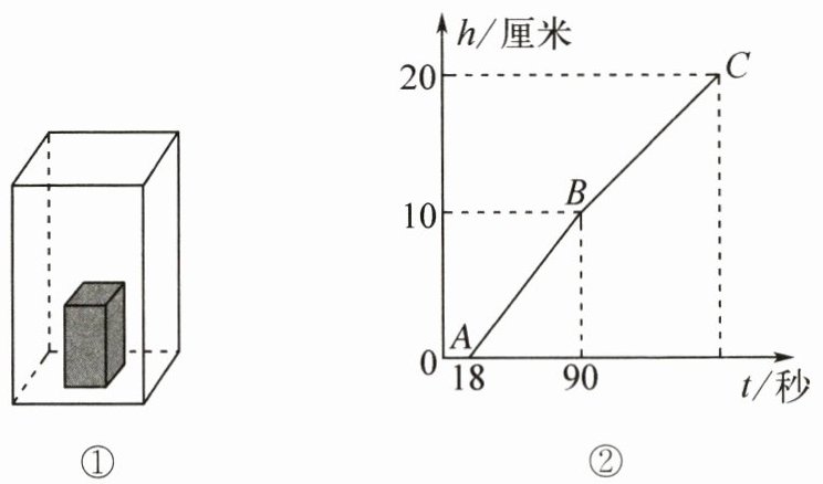 (1)A B 解析:由图②可知,在0~18秒的时间里,水槽中水面的高度没有上升,即在这个时间里,一直是向烧杯中注水而没有向水槽里注水;从18秒开始水槽中水面开始上升,即此刻烧杯中刚注满水;在18~90秒的时间里,水槽中的水面高度以恒定不变的速度上升,而到90秒时,水槽中水面高度的上升速度减缓,说明此刻水面的高度已经与烧杯中的水面齐平。 (2)解:设烧杯的底面积为x平方厘米。 $\frac{x}{100-x}=\frac{18}{90-18}$ x=20 (3)$20×10÷18=\frac{100}{9}$(立方厘米/秒) $100×20÷\frac{100}{9}=180$(秒)