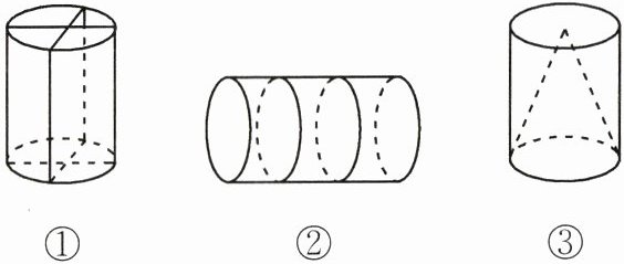 5. 同一个圆柱形木块若切成四块(如图①,沿底面直径切),则表面积增加48平方厘米;若切成三块(如图②),则表面积增加50.24平方厘米;若削成一个最大的圆锥(如图③),则体积减少了(