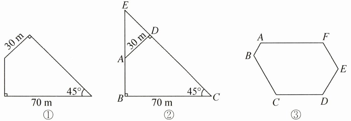 奇奇灵光一闪,想到了一个好办法,他把四边形的两条边延长,使它们相交于点$E$(如图②)。他发现,因为$∠C= 45^{\circ}$,$∠B= 90^{\circ}$,所以$∠E= 45^{\circ}$,三角形$BCE$是一个等腰直角三角形,三角形$BCE的面积就是70×70÷2= 2450$(平方米)。又因为$∠ADE= 90^{\circ}$,$∠E= 45^{\circ}$,所以三角形$ADE$也是一个等腰直角三角形,它的面积是$30×30÷2= 450$(平方米),所以原来四边形的面积$=三角形BCE的面积-三角形ADE的面积= 2450-450= 2000$(平方米)。