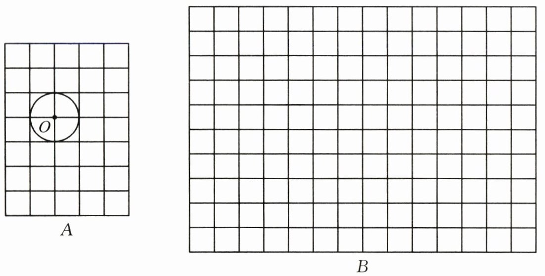 1. 把图A按顺时针方向旋转$90^{\circ }$,并按一定的比例放大为图B,请在图B中相应的位置,画出放大后的圆。(2分)